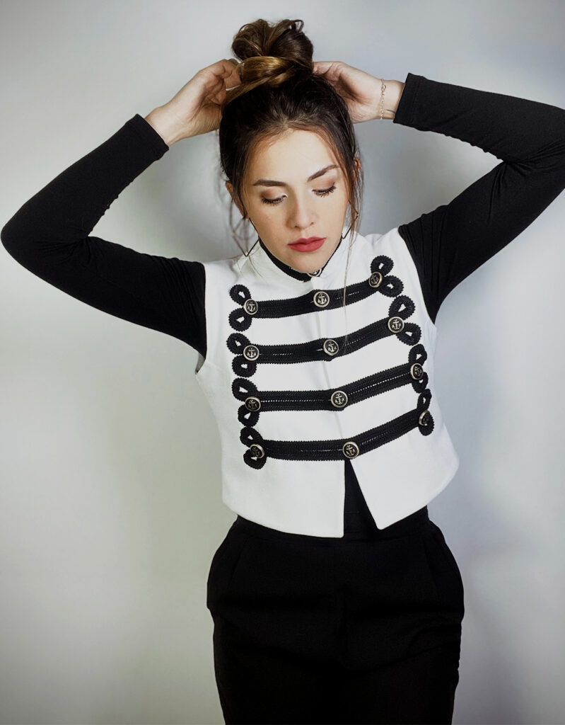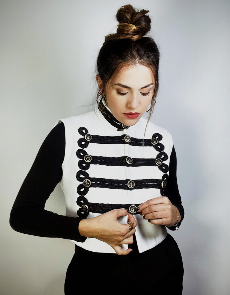 Fuerza y estilo en una sola prenda. El Chaleco Militar está confeccionado en elegante paño de cachemir, con un forro estampado que añade carácter y distinción. Sus bolsillos interiores ofrecen practicidad sin perder su estética sofisticada. Perfecto para crear looks con actitud y un toque atemporal.